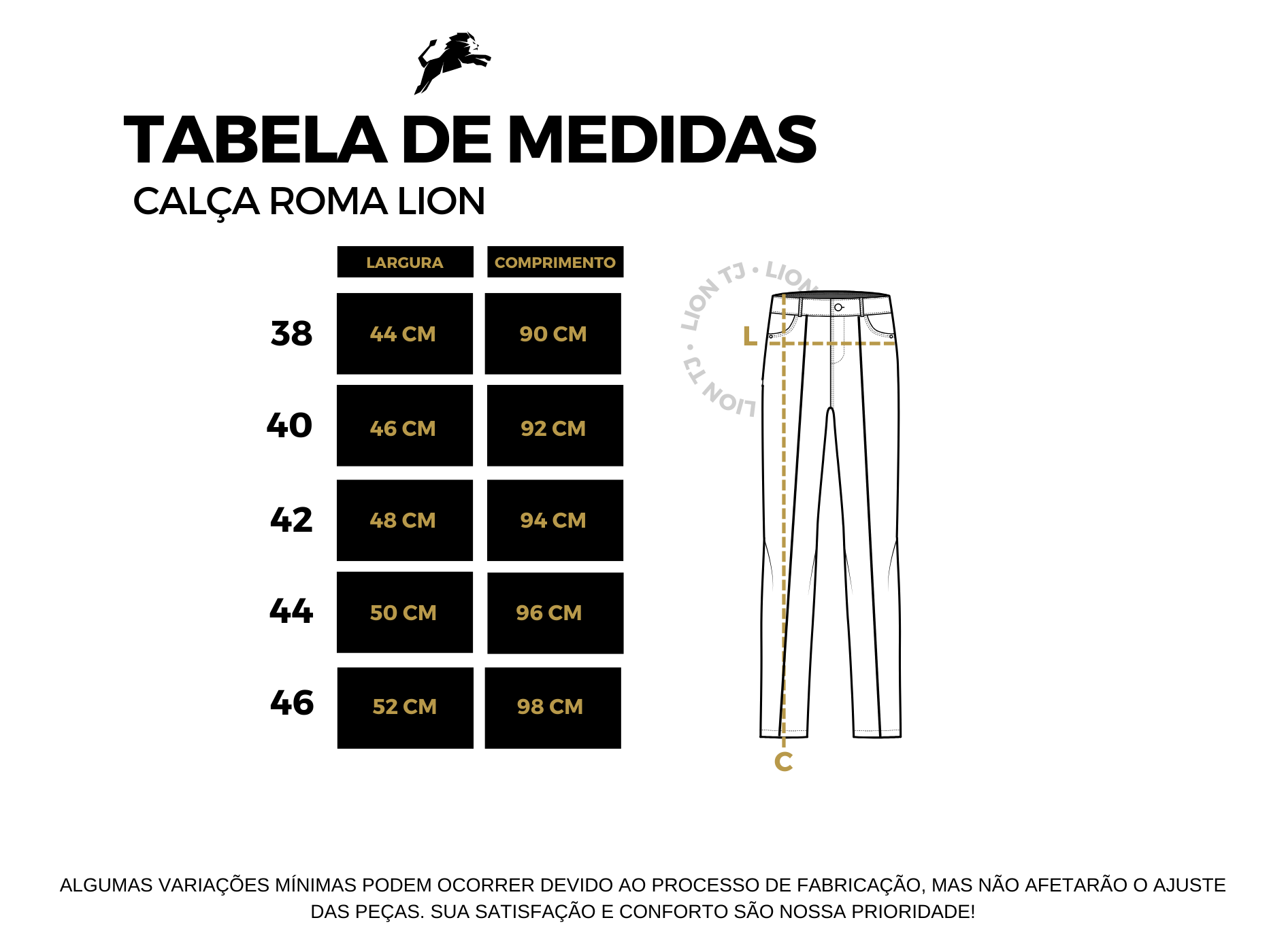 A Calça Roma Lion foi criada para quem valoriza peças que comunicam excelência. O tecido Roma apresenta um acabamento refinado, com firmeza no caimento e toque superior que entrega presença imediata. A elasticidade precisa mantém o conforto, enquanto a estrutura bem definida preserva um visual alinhado do início ao fim do dia. É uma peça construída para elevar o padrão do look, com detalhes discretos e sofisticados que reforçam autoridade e estilo.